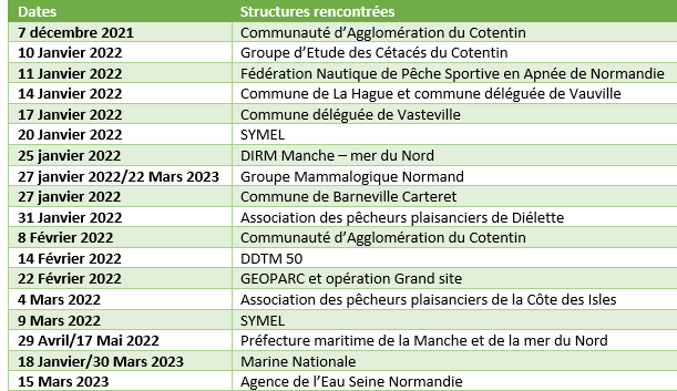 Tableau récapitulatif des rencontres de déc 2021 à mars 2023 (réunions en dehors des Groupes de Travail collectifs). Ont été rencontrés les représentants des structures ayant répondues à la proposition de rencontres faisant suite au GT de juillet 2021.