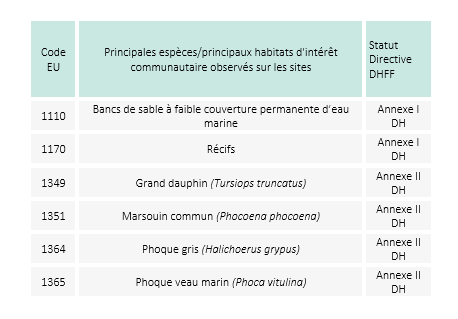Les sites Natura 2000 "Banc et Récifs de Surtainville" et "Anse de Vauville" sont principalement ciblés pour les habitats d'intérêt communautaire "Bancs de sable à faivble couverture permanente d'eau marine" (1110) et "Récifs" (1170).