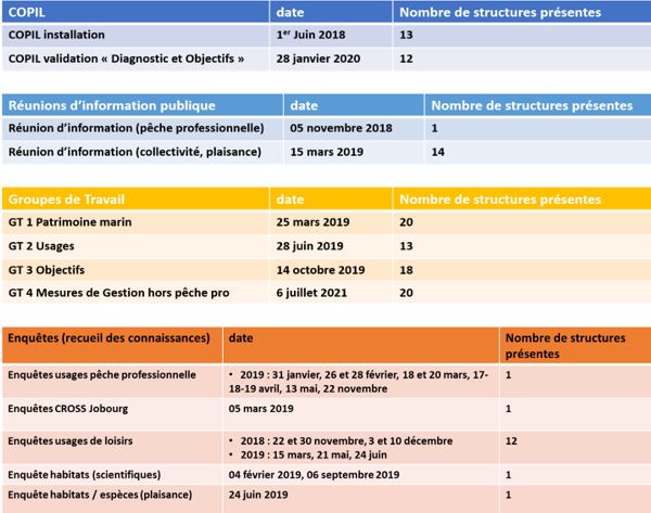 Tableaux récapitulatifs de l’ensemble des réunions de concertation et comités de pilotage (COPIL)