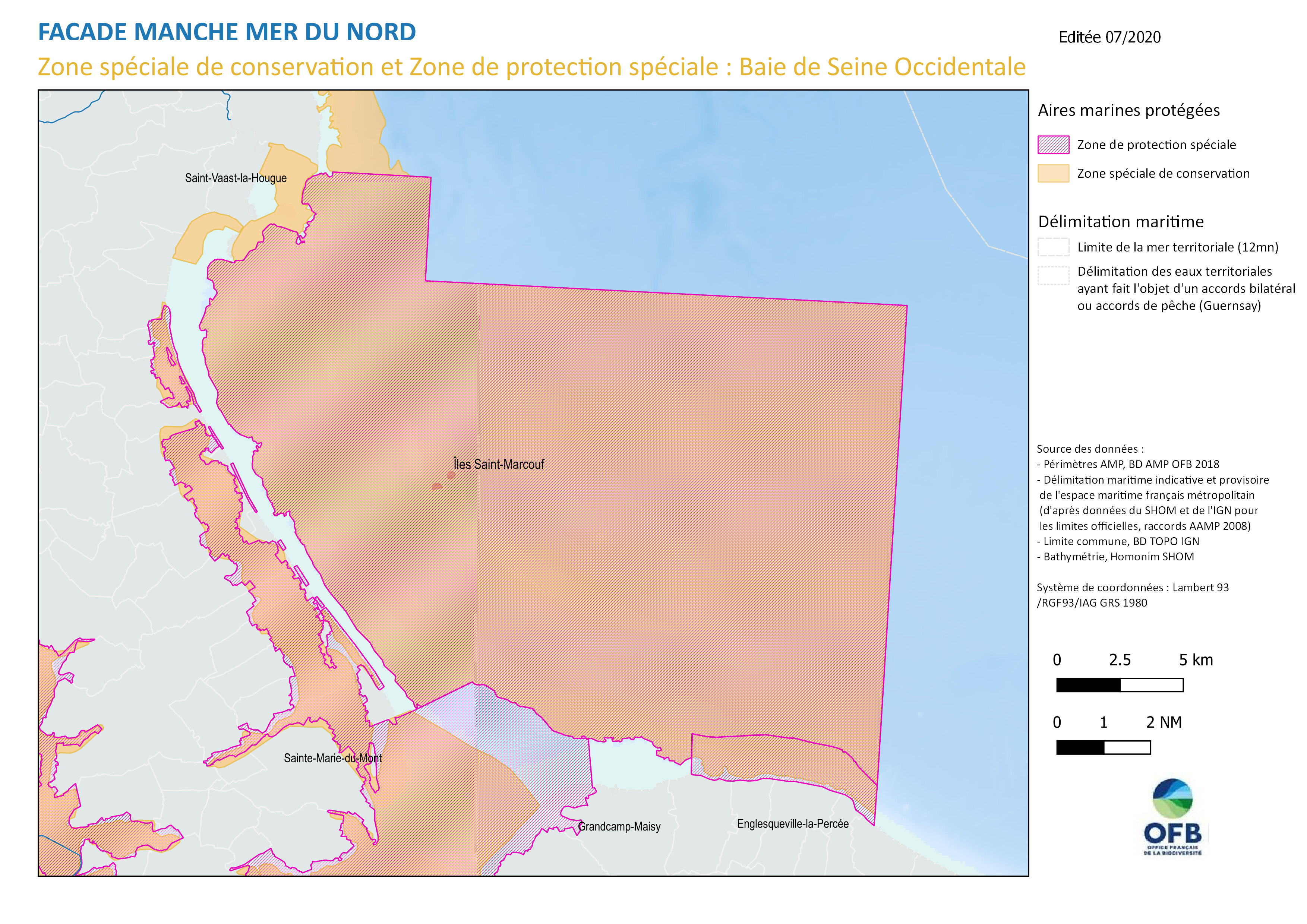 D'une superficie de plus de 450 km², la zone bénéficie d'une forte diversité biologique ayant justifié sa désignation et son intégration au réseau européen. Situé dans les eaux côtières des départements de la Manche et du Calvados, ce site marin a la particularité d'abriter les îles Saint-Marcouf comme seule portion terrestre. La ZPS est directement issue de l'ancienne Zone de protection spéciale "îles Saint-Marcouf" (désignée par arrêté du 6 janvier 2005), et ayant fait l'objet d'une extension marine en 2008).