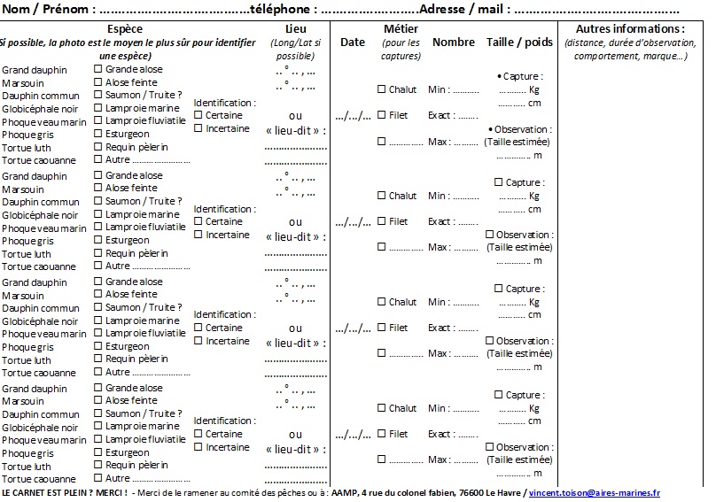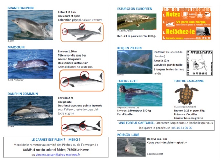Un carnet d'observations est à la disposition de tous les usagers du milieu marin pour faciliter la transmission de vos données. Il peut vous être adressé en format papier sur simple demande, ou être téléchargé en cliquant sur les images suivantes :